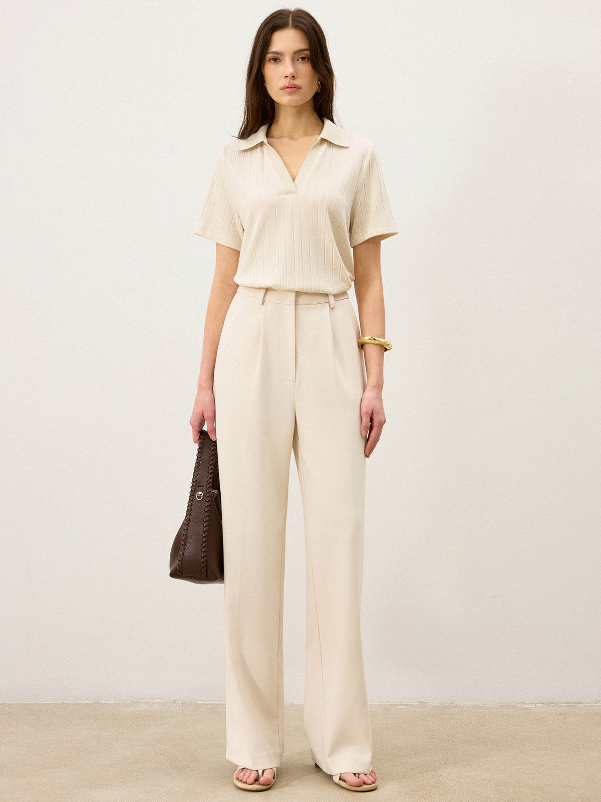 The Ribbed Knit Polo Top is a timeless essential with understated elegance. Featuring a subtle vertical rib texture and soft open collar, this short-sleeve knit is designed in a creamy neutral tone that pairs effortlessly with both casual and tailored pieces.